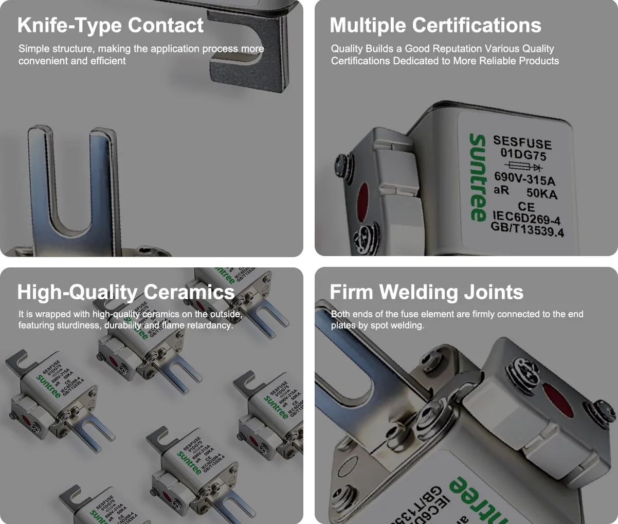 • Struktur dan prestasi mematuhi GB13539/EC60269/UL248.